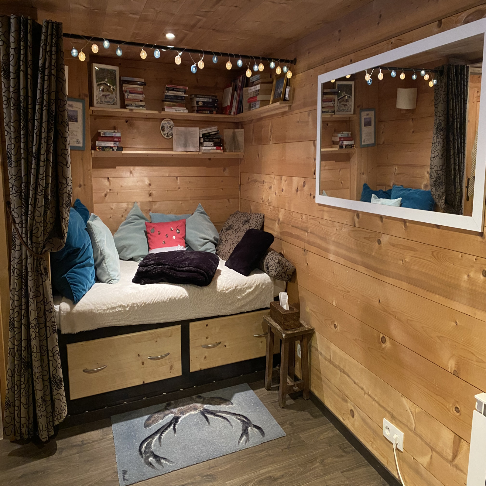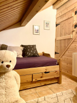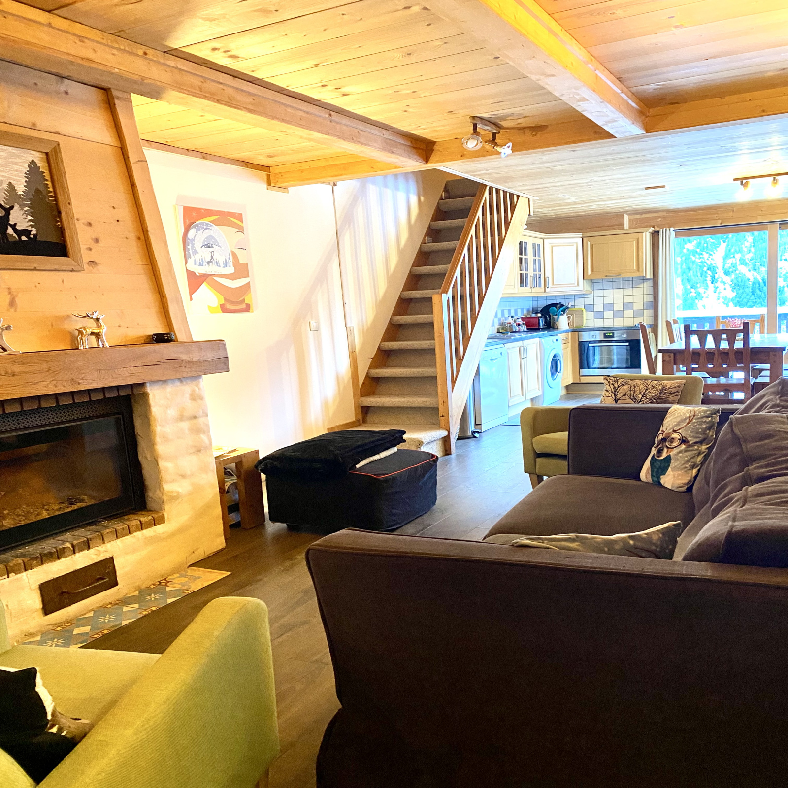 Réparti sur deux niveaux, il offre un coin TV/lit de jour spacieux attenant au salon cosy avec cheminée, une cuisine ouverte, une grande chambre, une salle de bains avec baignoire, ainsi qu’un balcon et une terrasse avec vue sur les montagnes. À l’étage, deux chambres complètent cet espace qui permet au total d'accommoder 8 couchages dans l’appartement.