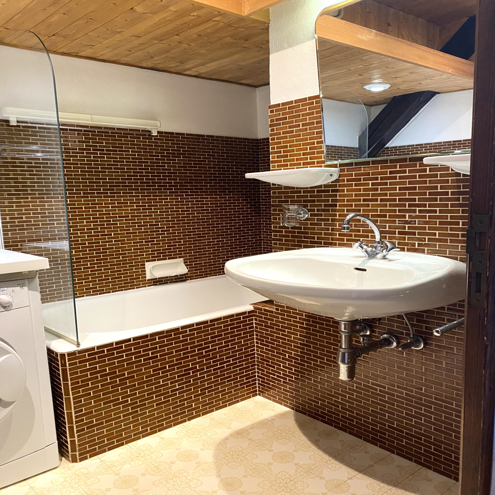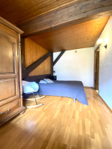 Il offre une pièce de vie agréable avec balcon, une cuisine séparée, WC, et à l'étage une grande chambre sous les combles avec salle de bains.