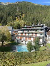 Résidence avec piscine extérieure et casier à ski, ce bien allie charme alpin et confort.
