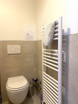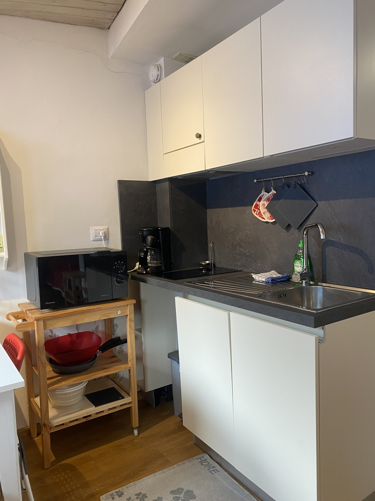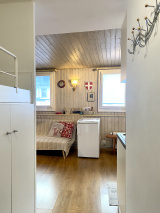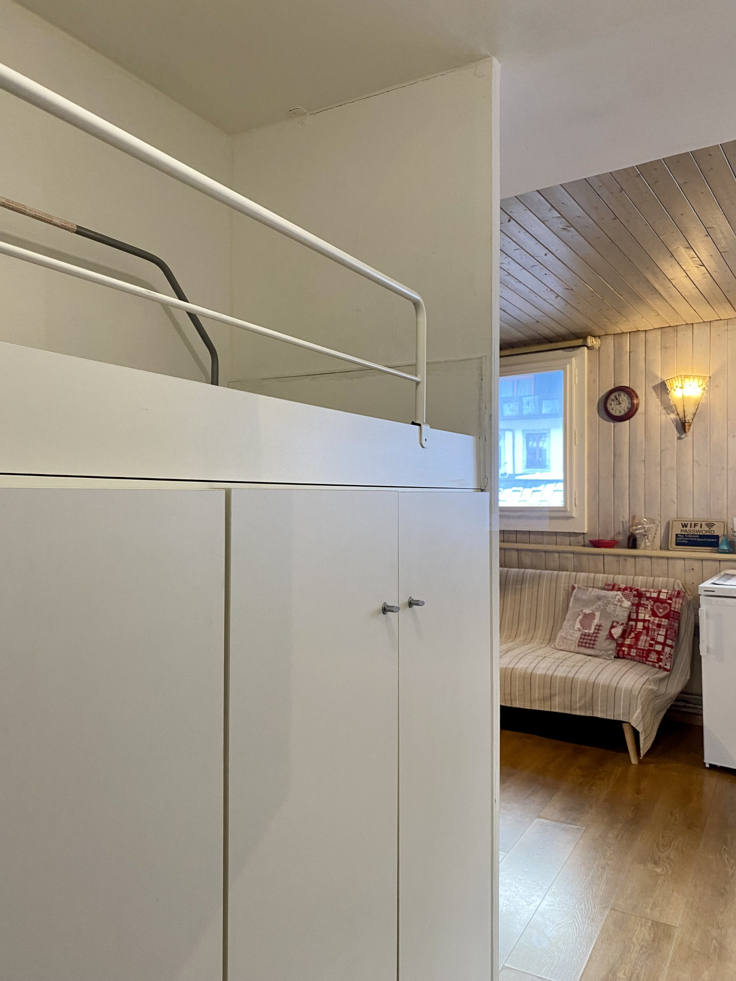 Ce grand studio offre une pièce de vie spacieuse, un coin nuit double, un recoin à l'entrée avec rangements et lit simple additionnel, une salle de douche avec WC entièrement rénovée et une kitchenette neuve et foncitonnelle.