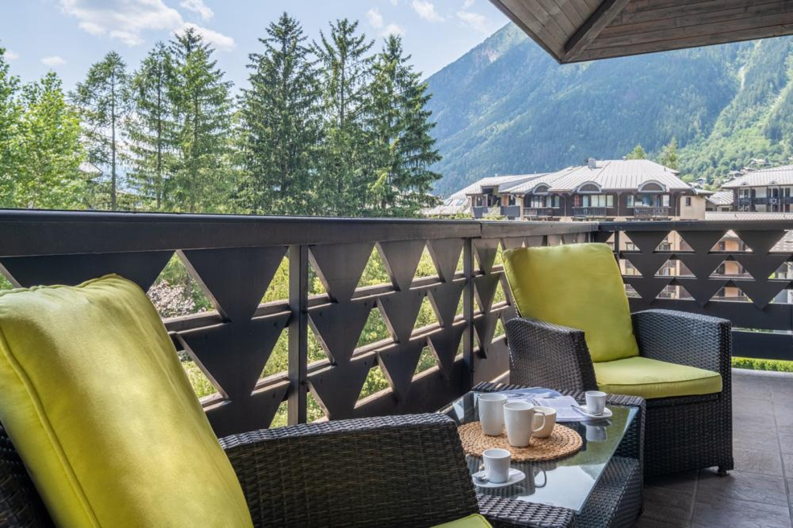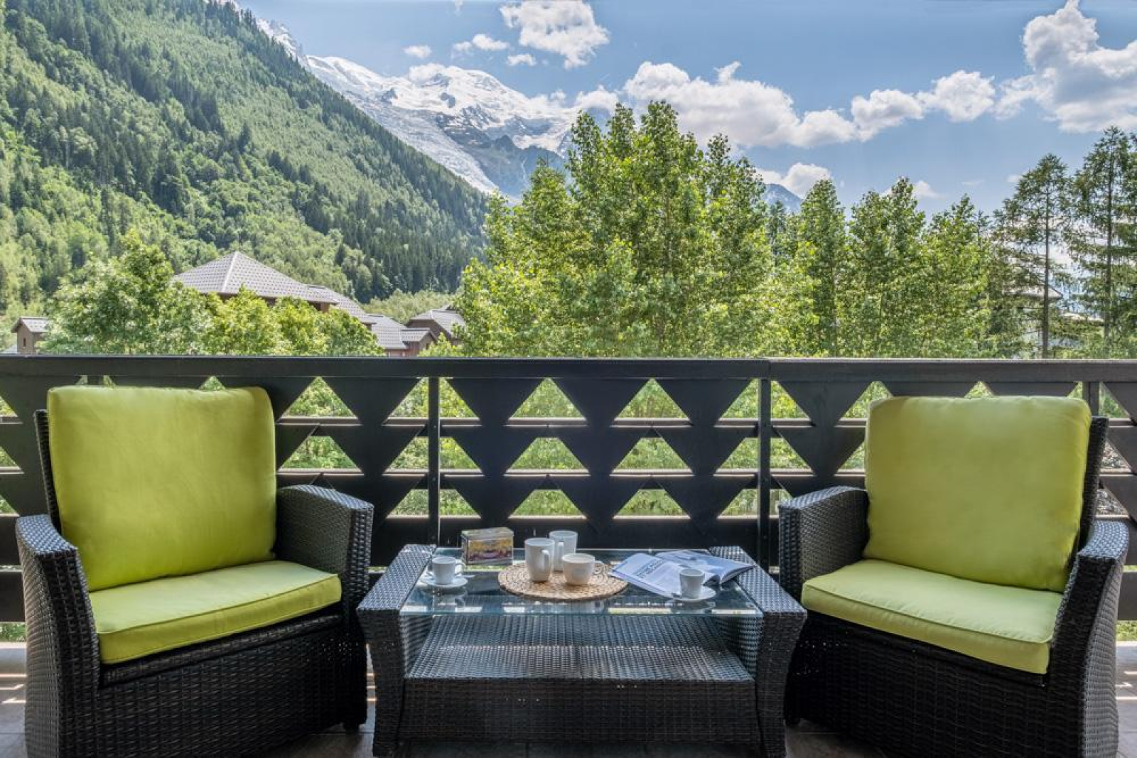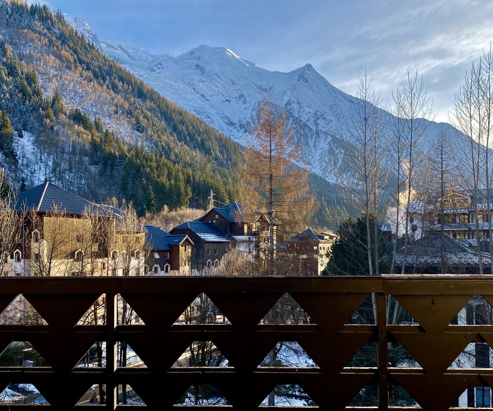 Le véritable coup de coeur se trouve à l'extérieur: un spacieux balcon avec une vue imprenable sur le Mont-Blanc, dominant les toits de Chamonix.